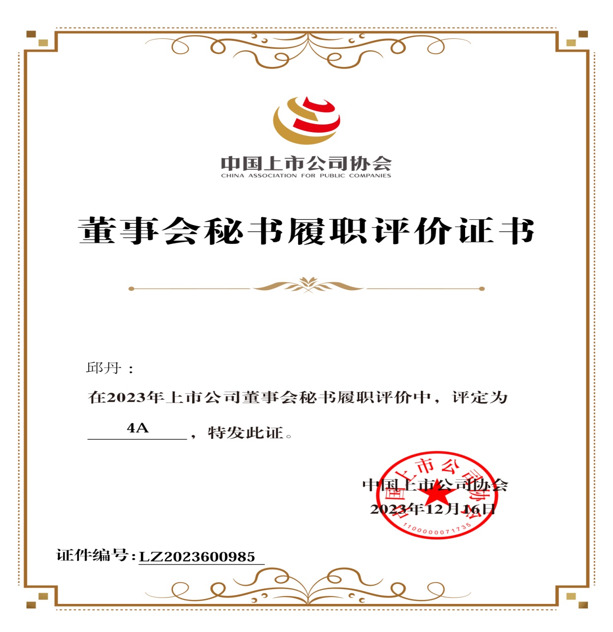 党委常委,淮北矿业副总经理、董事会秘书邱丹连续两年荣获董事会秘书履职4A评级,证券投资部首次荣获董办优秀实践案例。