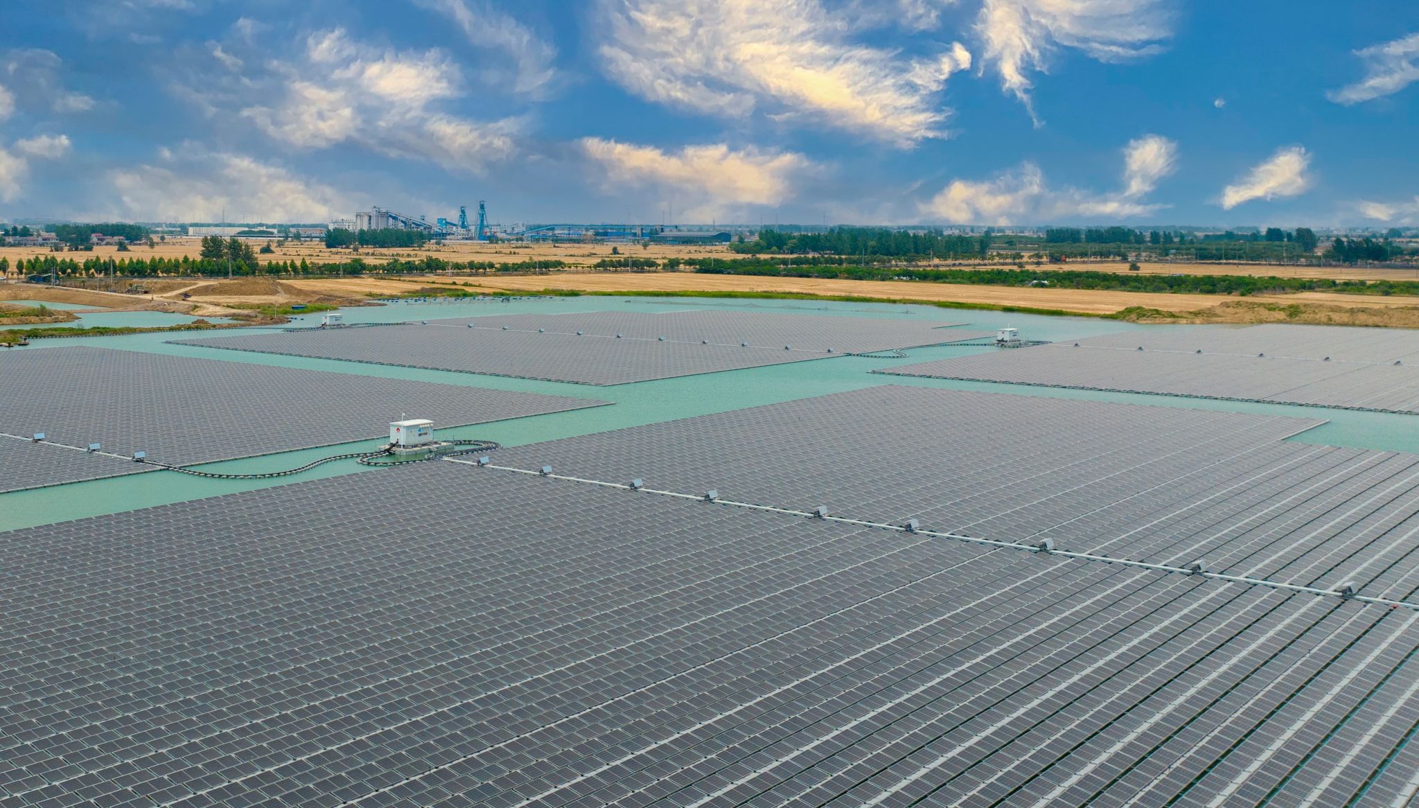 昔日的采煤沉陷区,如今铺满蓝色光伏板。孙疃32兆瓦、青东28兆瓦、袁一90兆瓦水面光伏电站,每年生产绿电1.6亿千瓦时,节省标煤约5.09万吨,年减少二氧化碳排放13.74万吨。